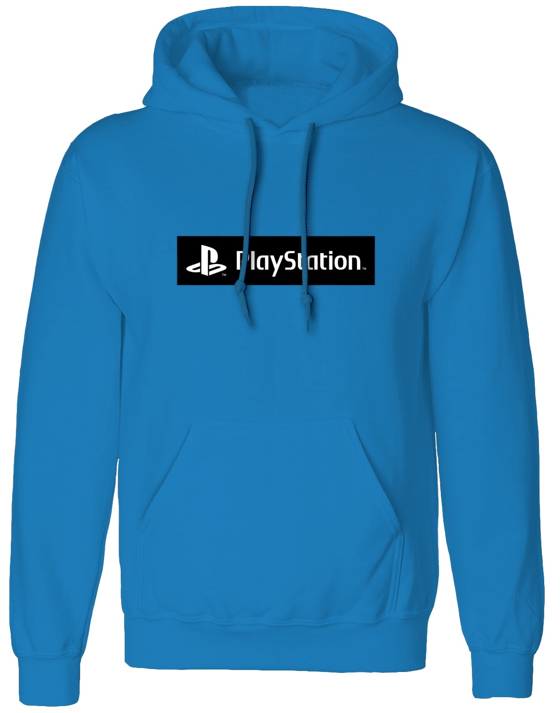 Modrá mikina s kapucí, stahovatelnou na šňůrky, vyvedená s logem a nápisem Playstation v rámečku.
