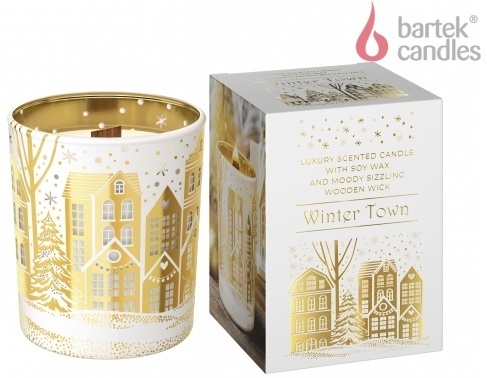 Vonná svíčka ve skle 200g s dřevěným knotem v krabičce - Winter Town je součástí kolekce polské značky Bartek Candles