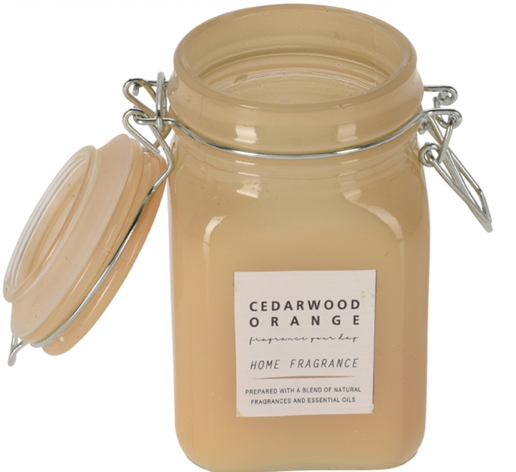 Vosková svíčka ve skleněné dóze s víčkem. Vůně cedrového dřeva a pomeranče.