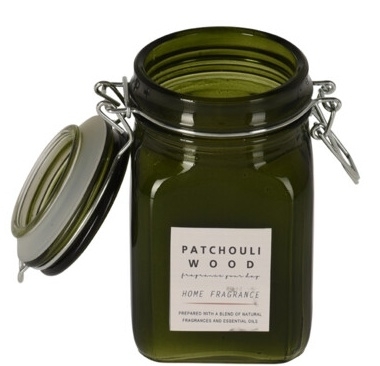 Vosková svíčka ve skleněné dóze s víčkem. Vůně pačulového dřeva.