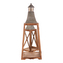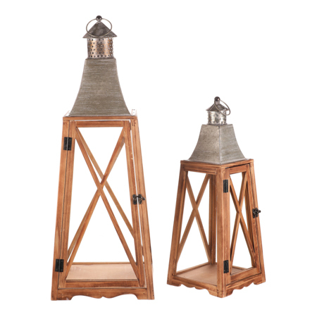 Tato čtyřboká dřevěná lucerna ve tvaru jehlanu je k dispozici v sadě dvou velikostí, které dodají vašemu prostoru příjemné světlo a stylový nádech. Rámy v přírodní barvě dřeva ladí s kovovým vrškem ve stříbrném odstínu, což lucernám přidává elegantní kontrast. Díky kroužku na vrcholu je snadno zavěsíte a přenesete tam, kam je třeba.