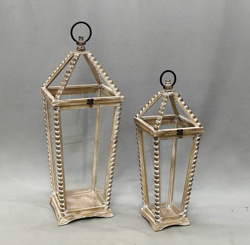 LOKKE Komplet 2 Latarni to dekoracyjny zestaw dwóch dużych latarni wykonanych z jasnego drewna, wyróżniających się eleganckim wykończeniem oraz subtelnymi zdobieniami. Większa latarnia ma wymiary 29,5 29,5 76,5 cm, natomiast mniejsza 22 22 59,5 cm. Obie posiadają harmonijną, klasyczną formę z przeszklonymi ściankami, dzięki czemu świetnie eksponują światło i dekoracje umieszczone wewnątrz.Cechą charakterystyczną kompletu są dekoracyjne kulki, które zdobią konstrukcję i dodają całości delikatnego, ozdobnego akcentu. Latarnie otwierają się od góry, co ułatwia dostęp do wnętrza i pozwala wygodnie umieszczać świece, lampki LED czy sezonowe ozdoby. Jasne drewno nadaje im świeżości i uniwersalności, dzięki czemu idealnie komponują się zarówno z aranżacjami wnętrz, jak i przestrzenią ogrodową, tarasem czy balkonem.Zestaw tworzy ciepłą, przytulną atmosferę i stanowi stylową dekorację, która pasuje do wielu stylów . od skandynawskiego, przez rustykalny, aż po klasyczny. To doskonały wybór na cały rok, również jako element świątecznych lub romantycznych kompozycji świetlnych.