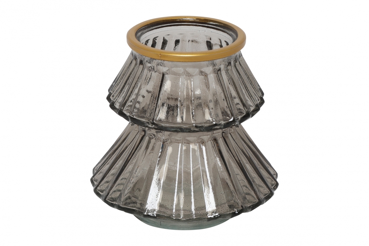Elegantní skleněný svícen Talline S v šedém tónu s jemným žebrováním a zlatým okrajem přináší stylový nádech do každého interiéru. Díky svému tvaru připomínajícímu stromeček se hodí i jako jemná vánoční dekorace, ale skvěle vynikne i po celý rok. Teplé tóny skla v kombinaci s lesklým detailem působí hřejivě a luxusně.