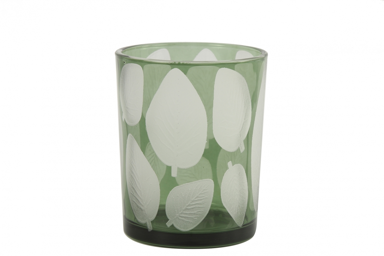 Skleněný svíce s dekorováním v podobě bílých lístků.