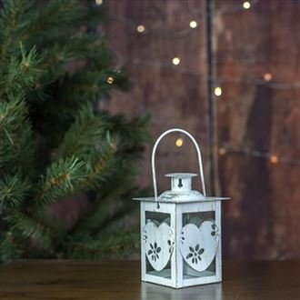 Tato elegantní lucerna v bílém provedení je zdobena srdíčky, která vytváří příjemný dekorativní prvek i když zrovna není zapálená svíčka. Její kompaktní rozměry (7,2 x 7,2 cm, výška 11 cm) umožňují snadné umístění na různá místa - na okno, stůl či polici. Vyrobena je z kvalitního kovu a skla, které zajišťují odolnost i stabilitu při používání.