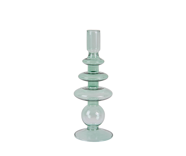 Skleněný svícen v zelené barvě.