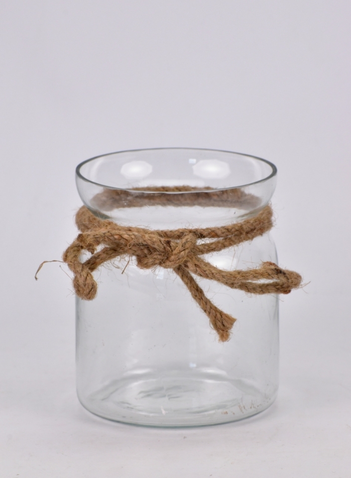 Skleněný svícen nebo vázička s jutovým provázkem.