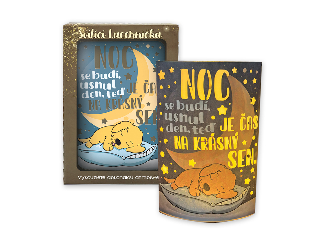 Svítící lucerna s textem „Noc se budí, usnul den, teď je čas na krásný sen.“