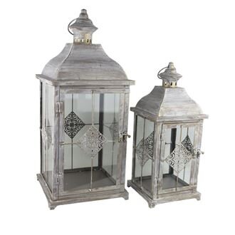 Sada kovových luceren.Sada obsahuje 2 lucerny o dvou velikostech. Malá lucerna má rozměry : 16 x 16 cm, výška 37,5 cm.Velká lucerna má rozměry : 22 x 22 cm, výška 51,5 cm.Barva : kombinace hnědá se zlatou.Materiál : kov, sklo.