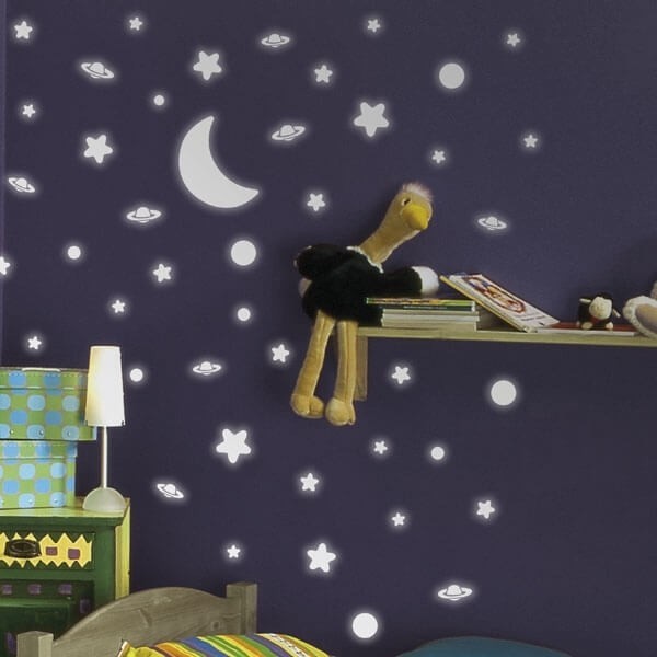 Nástěnná samolepka potištěná luminiscenční barvou, ve tmě svítí, snadno se nalepí i odstraňuje ze stěn nebo jiného hladkého povrchu. Je vyrobena z kvalitního netoxického vinylu bez ftalátů, s netoxickým akrylovým lepidlem na bázi vody.