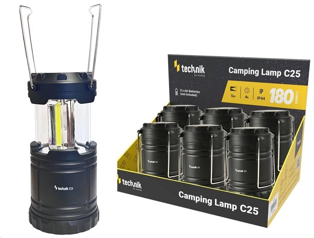 (BAL:1/6/48ks) Camping lamp C25 kempingová lampa 3xAA 180lm LED COB. Zdroj světla: 3x LED COB.Materiál: plast. Napájení: 3xAA (nejsou součástí). Režim: zap./vyp. - vytažením. Dosah: max. 5m. Doba svícení: až 4hod. (dle baterií). Světelný tok: 180lm. Teplota světla: bílá. Stupeň krytí: IP44. Možnost uchycení: k zavěšení, volně stojící. Rozměr: 184 x 85mm.Váha: 220g. Displej box: 6ks.Barva: černá. Balení: volně.Cena za 1ks.