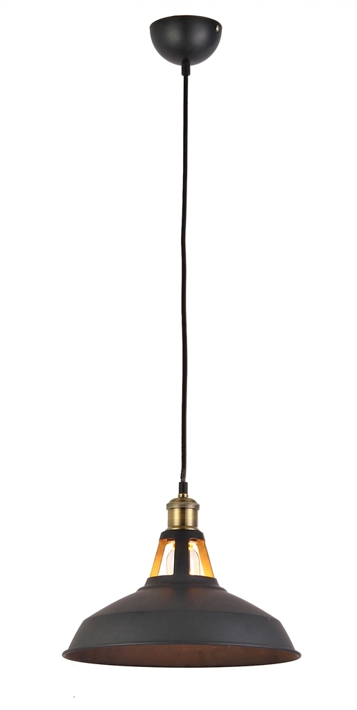 jednoduchý rustikální lustr New Axel z kolekce designového interiérového osvětlení AZzardo je ideální do kaváren či restaurací, ale i do domácností nad jídelní stůl či barový pult kruhové kovové stínidlo o průměru 31 cm s matně černým povrchovým lakem je doplněno o zlatavě mosaznou objímku skrz pravidelné otvory v horní části stínidla příjemně prosvítá svit žárovky, což umožňuje částečné směrování svitu i do okolního prostoru, nikoli jen dolů pod svítidlo je osazeno paticí E27 pro žárovku o max. příkonu 1 x 60 W, která není dodávána se svítidlem pro úsporu energie je vhodné použít LED žárovku s dlouhou životností pro dokreslení vintage stylu doporučujeme použití LED žárovky s filament viditelnými vlákny délka zavěšení je flexibilně nastavitelná při instalaci až do 150 cm krytí IP20 vyjadřuje vhodnost použití pouze v interiéru