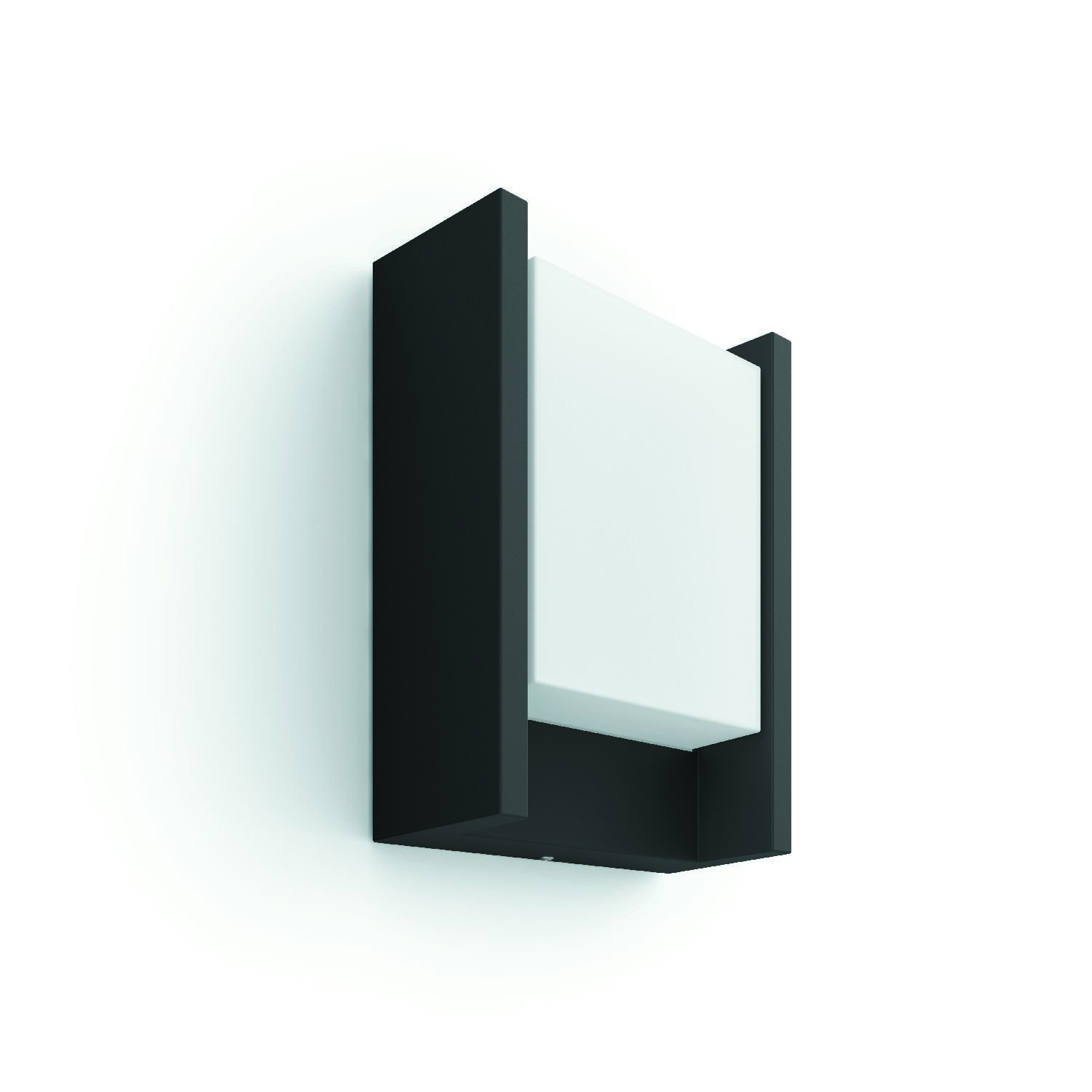 Venkovní nástěnné svítidlo Fuzo z kolekce Philips Hue ve větší verzi vyzařující svit do třech směrů a s možností garantovaného jemného ztlumení pomocí aplikace z chytrého mobilního zařízení po připojení přes můstek Philips Hue Bridge, který není dodáván se svítidlem. Pro jeho výrobu byl použit kvalitní tlakově litý hliník v černé barvě v kombinaci s bílým plastovým difuzorem. Svit zajišťuje integrovaný úsporný vysoce výkonný LED zdroj Hue White s možností regulovat intenzitu teplého žlutého světla s teplotou chromatičnosti 2700 K. Příkon zdroje činí 1 x 15 W se svítivostí až 1150 lm. Životnost zdroje je extrémně dlouhá až 25.000 hodin. Krytí IP44 označuje voděodolnost a vhodnost pro použití ve vlhkém venkovním prostředí. Celkové rozměry svítidla činí 22,1 x 16,6 x 7,5 cm. Je určeno k napájení ze sítě na 220-240 V a vztahuje se na něj záruka 2 roky.
