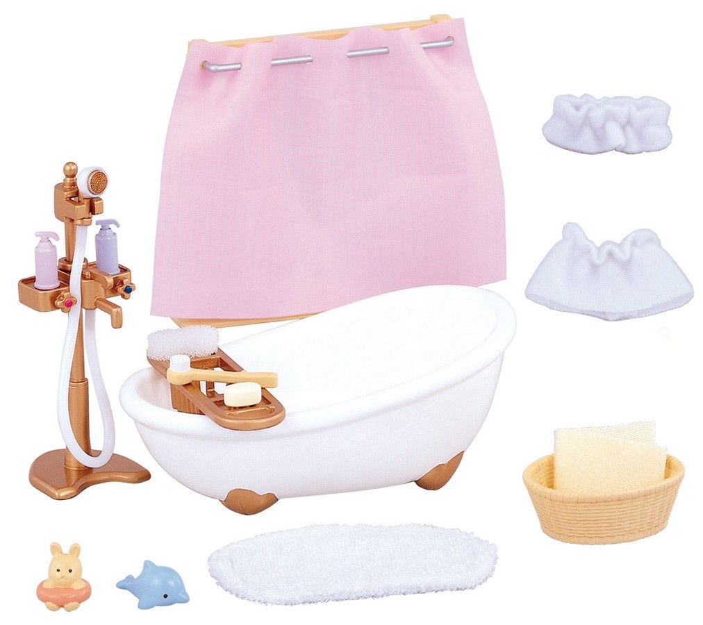 Koupelna s příslušenství set Tato koupelna ve starožitném stylu s vanou a ve zlaté barvě sprchy vás okouzlí. Nabízí nejen šampon a kondicionér, ale také hračky, koupelnový koš, ručník-sukni a dětskou čelenku, předložku před vanu a závěs. Je čas na báječnou koupel! Neobsahuje figurku. Rozměr balení: 12,8 x 9,7 x 7,3 cm Vhodné pro děti: 3+