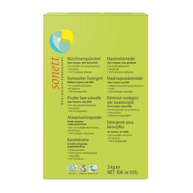 Tento 100% přírodní prášek do myčky od Sonettu snadno čistí i zaschlé skvrny i přesto, že neobsahuje enzymy, fosfáty, tenzidy a agresivní odstraňovače skvrn na bázi chlóru.