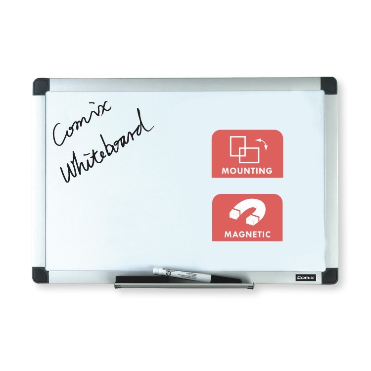 Magnetická tabule Comix BO9012 kvalitní bílá magnetická tabule s odolným povrchem z bílé lakované oceli vsazená do elegantního moderního rámu z eloxovaného hliníku. Vysoká odolnost povrchu tabule proti poškrábání je dosažena vypálením emailového laku při vysoké teplotě. Hrany rámu v plastovém provedení. Psací plocha je snadno stíratelná a popisovatelná za sucha při použití houby určené pro magnetické tabule (houba není součástí balení). Tabule je vybavená poličkou pro popisovače a další příslušenství.
