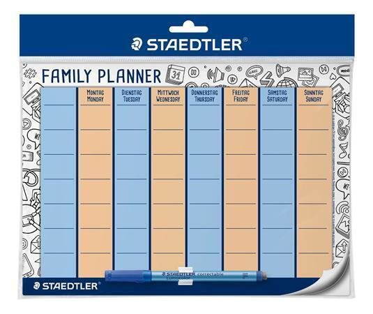 Plánovací rodinná tabule s popisovačem, ideální pro společné plánování. Znovu použitelná, samolepicí Vhodná na rovné, suché povrchy Stíratelná za sucha Rozměr: 297 x 210 mm Popisovač Lumocolor součást balení