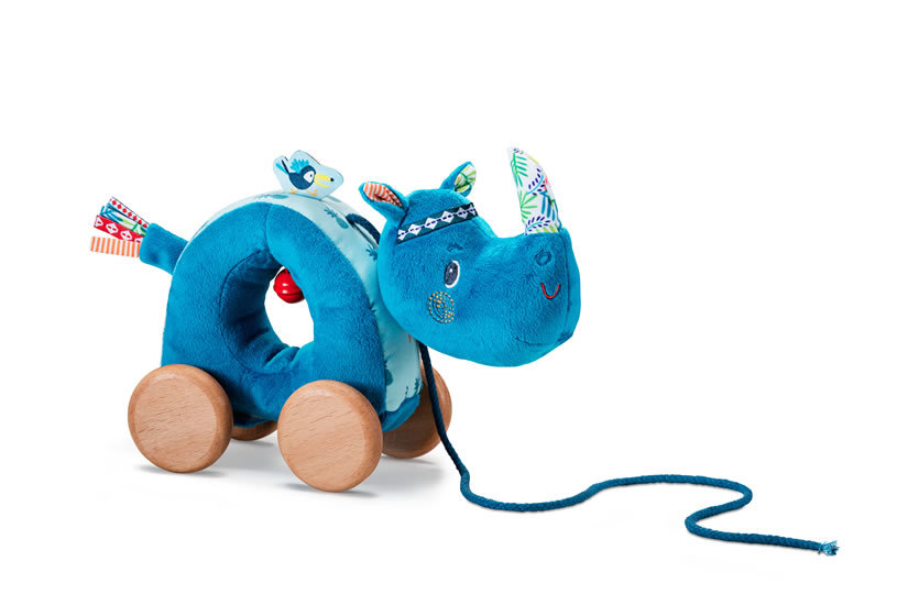 Nosorožec Marius doprovodí děti při prvních krůčcích. Když dítě zatahá za provázek, nosorožec zavrtí hlavou a zazvoní. Ulehčí dětem první krůčky a pomůže jim zvětšovat důvěru ve svoje schopnosti. Kolečka se dají snadno sundat, pokud se Marius potřebuje umýt. 24x10x14 cm