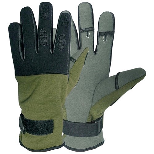 Neoprenové rukavice. Kvalitní rukavice navržené pro použití se zbraní. Manžeta na zápěstí stahovatelná pomocí suchého zipu. Palec, ukazováček a prostředníček lze odklopit a zajistit suchým zipem.