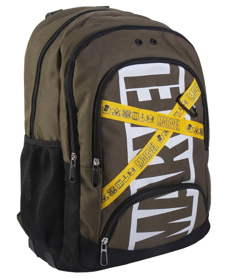 Tříprostorový zelený batoh s logem Marvel s malou přední kapsou a dvěmi bočními síťkovými kapsami na láhev. Batoh je polstrovaný s délkově nastavitelnými popruhy a uchem pro nošení v ruce.