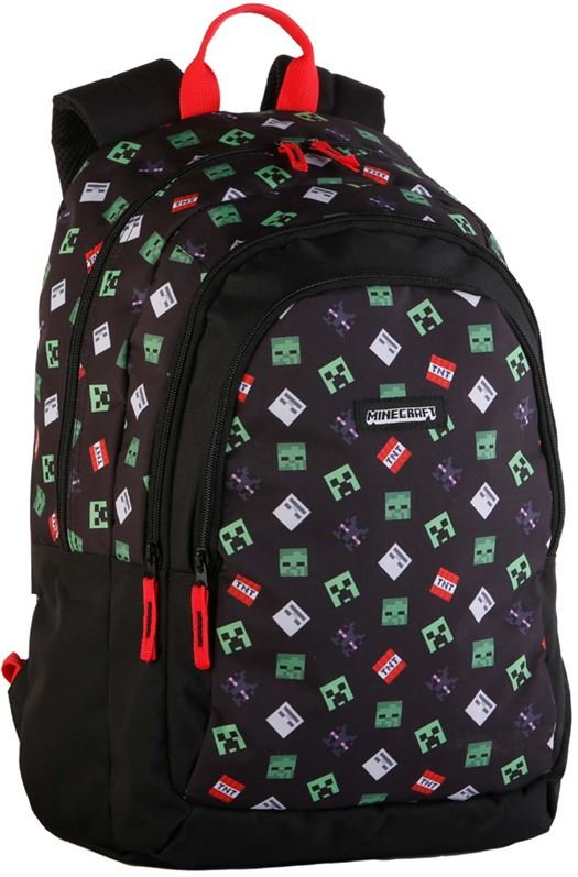 Prostorný černý batoh vyvedený v motivu hry Minecraft. Součástí jsou ergonomicky polstrovaná záda, délkově nastavitelné ramenní popruhy a ucho pro nošení v ruce. Zapínání je na zip.