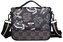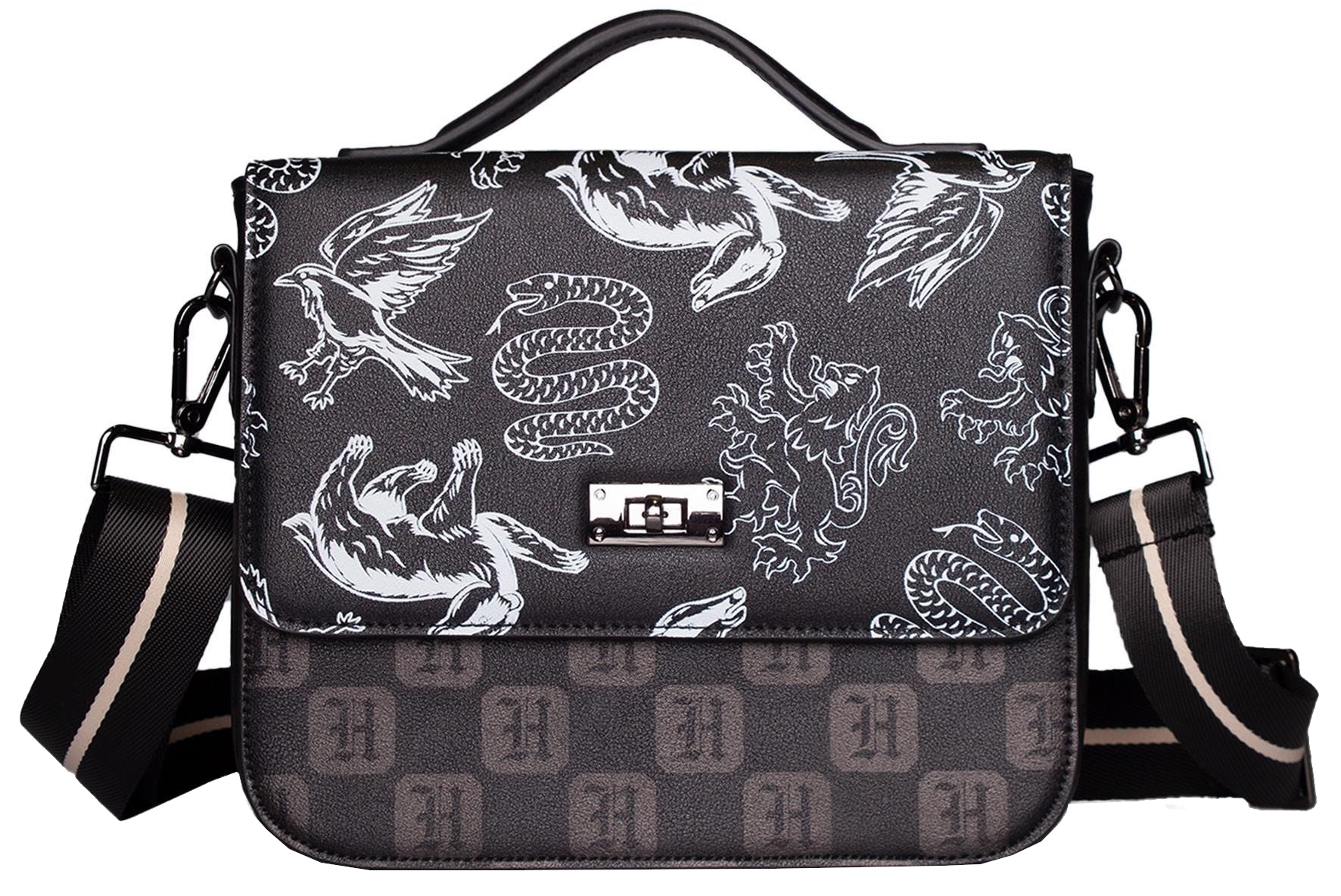 Černá dámská kabelka s popruhem přes rameno i uchem pro nošení v ruce s celoplošným potiskem zvířat bradavických kolejí.