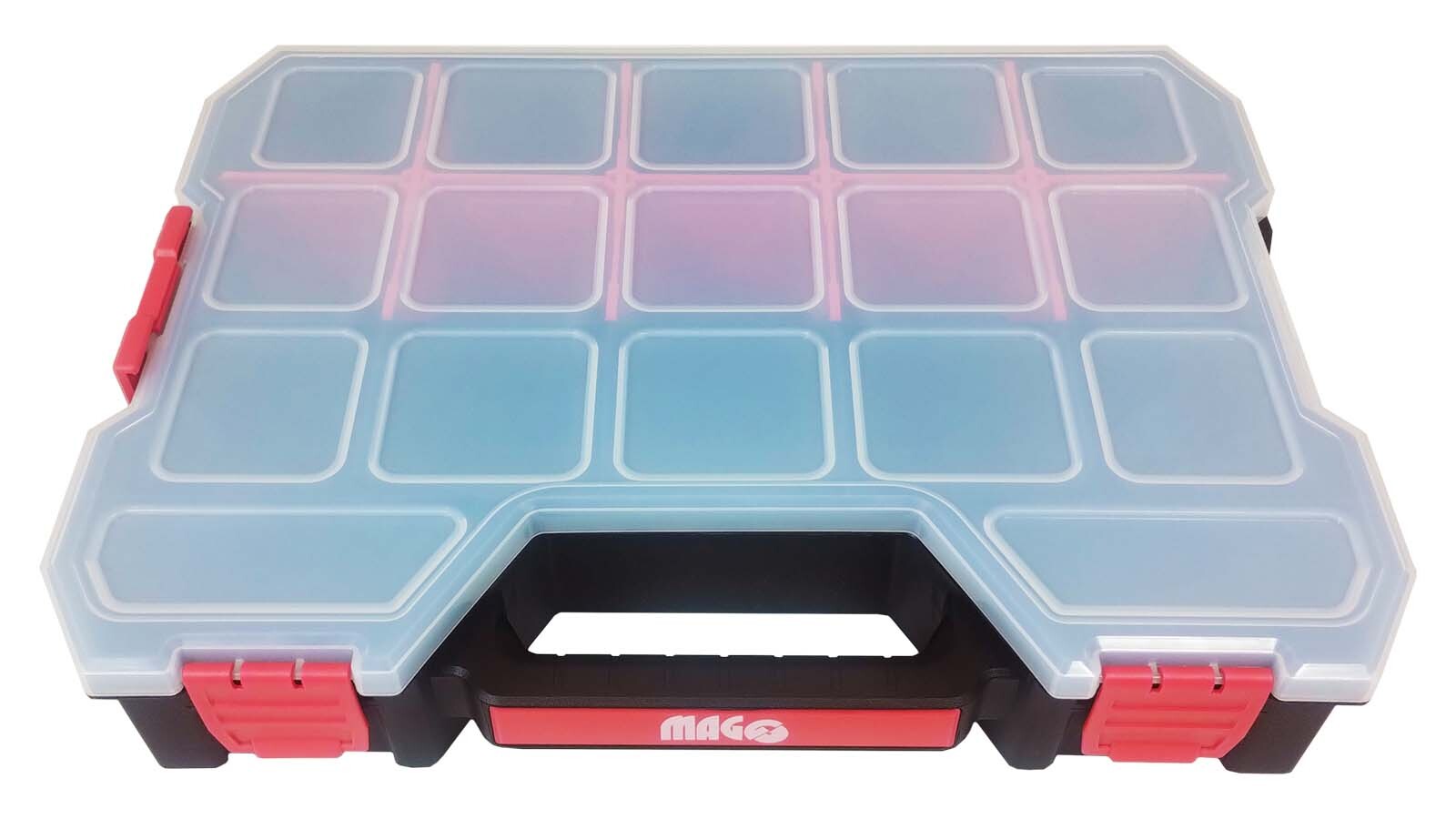 Dvojité uzavírání zajistí, že vnitřek zůstane bezpečně uložený, přestože organizér není uzamykatelný a nemá těsnící gumu kolem víka. Tento praktický organizér je skvělým řešením pro každého, kdo si chce zpřehlednit své pracovní nástroje či drobnosti denní potřeby.