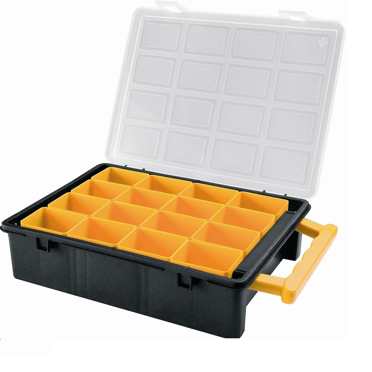 Mějte každý šroubek, korálek i háček vždy po ruce a perfektně srovnaný. Tento odolný organizér s průhledným víkem a sklopným madlem vám ušetří čas i nervy - okamžitě vidíte obsah a díky 16 vyjímatelným boxům si vše přizpůsobíte přesně podle potřeby.