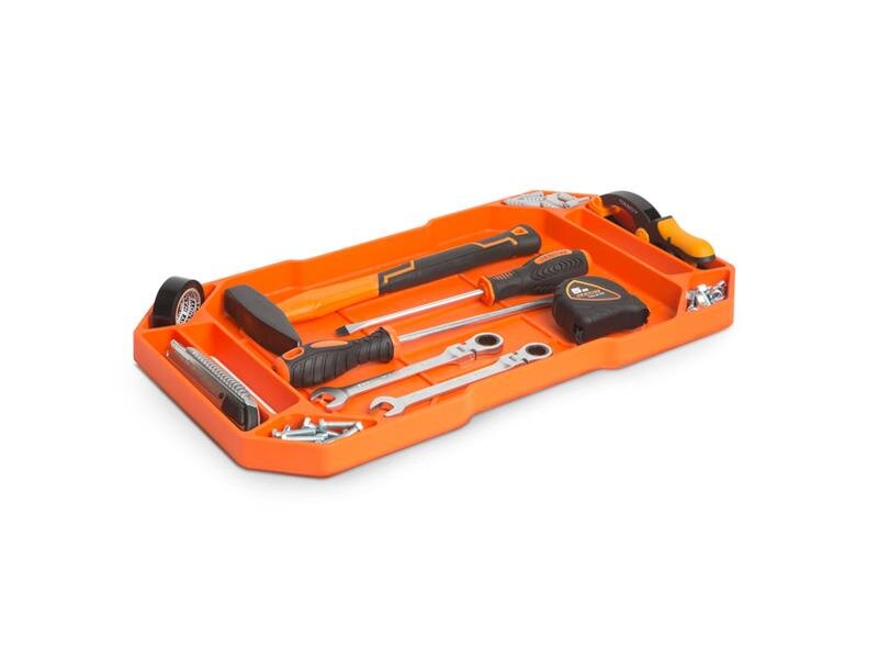 Inovativní produkt v různých velikostech, který usnadní uložení nářadí během montážních prací. Ruční nářadí se často během používání zašpiní, tomuto můžete předejít pokud je budete ukládat na tác. Potřebné šrouby a součástky můžete skladovat odděleně. Při ukládání nářadí absorbuje nárazy, díky čemuž se povrch nemůže poškodit. Může být ideální pro montážní práce kolem domu, elektrických montážích, renovacích nebo při opravě auta. 2 podlouhlé přihrádky, ideální na uložení delších šroubů 4 menší přihrádky Protiskluzová vakuová přilnavost 1 velký tác