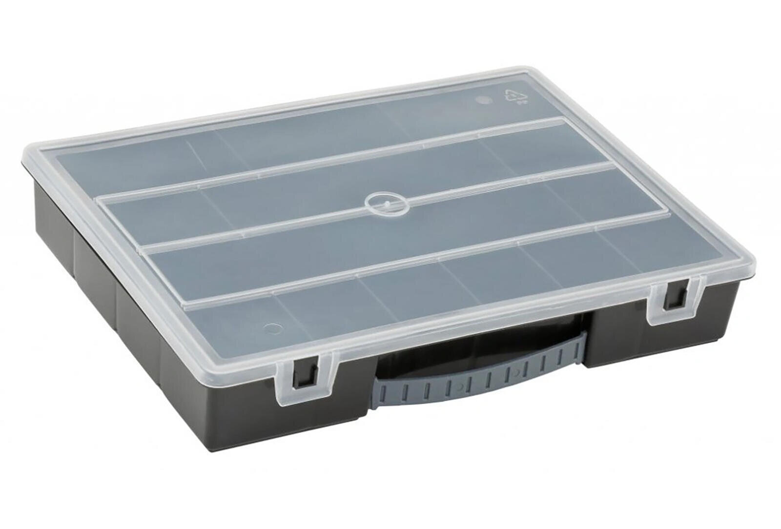 Základní organizér s transparentním víkemKomfortní rukojeťOdlehčené plastové těloPevné přihrádkyRozměry: 34 x 26 x 5,5 cm