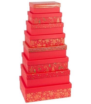 Sada dárkových krabic.Rozměry: 14,5 x 10 x 5 cm; 17 x 12 x 5,5 cm; 9 x 13,5 x 6 cm; 22 x 16 x 6,5 cm; 24,5 x 17,5 x 7 cm; 27,5 x 19,5 x 7,5 cm; 29 x 21 x 8 cm; 33 x 23.5 x 9 cm; 35 x 25 x 10 cm; 37 x 27 x 13 cm