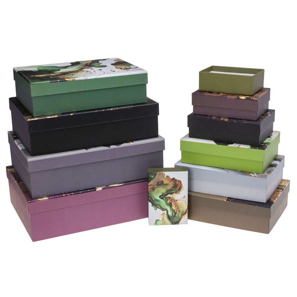 Sada dárkových krabic.Rozměry: 14,5 x 10 x 5 cm; 17 x 12 x 5,5 cm; 9 x 13,5 x 6 cm; 22 x 16 x 6,5 cm; 24,5 x 17,5 x 7 cm; 27,5 x 19,5 x 7,5 cm; 29 x 21 x 8 cm; 33 x 23.5 x 9 cm; 35 x 25 x 10 cm; 37 x 27 x 13 cm