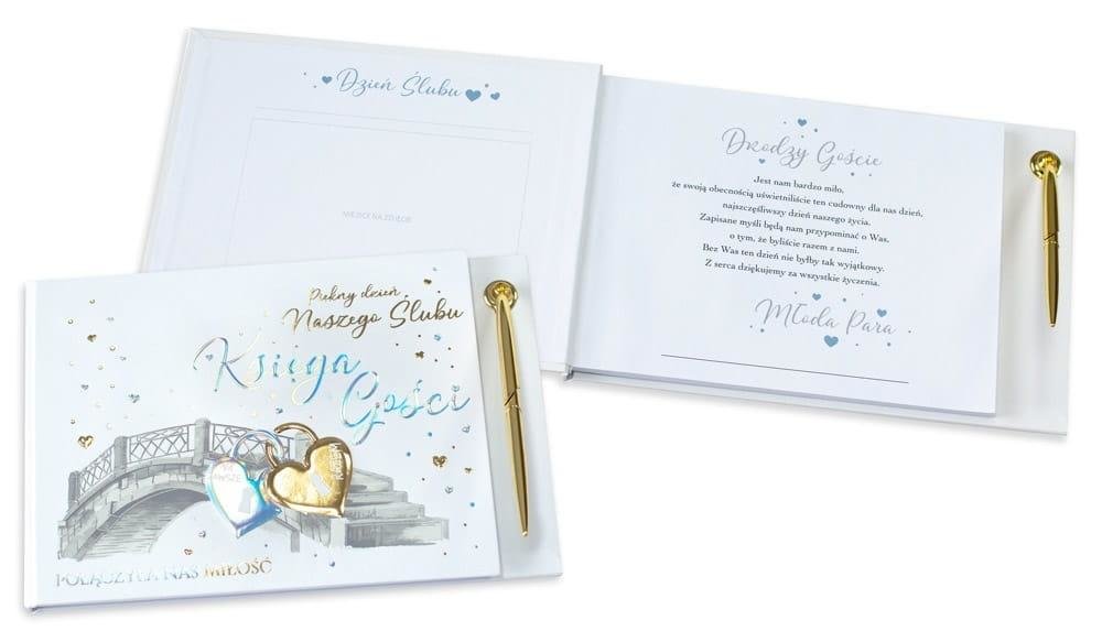 Księga gości Happy Book HBP-003 (prostokątna). Dzień ślubu pozostaje na zawsze w pamięci Młodej Pary. Ten dzień pełen szczególnych emocji wymaga wyjątkowej oprawy. Aby upamiętnić ten jedyny w swoim rodzaju moment życia Kukartka stworzyła piękne Księgi gości. Happy Book to album, który pozwoli zachować wspomnienia z tego najważniejszego dnia. Wpisy gości, zapiski, wspomnienia i złote myśli przetrwają przez całe życie. Dołożyliśmy wszelkich starań, aby nasz produkt był trwały, elegancki i najwyższej jakości (jak to zwykle w Kukartce). 40 białych kart na wpisy poprzedzonych jest stroną tytułową oraz miejscem na zdjęcie. Ekskluzywna okładka zdobiona jest złotą lub srebrną folią (hot Stamp). Dla ułatwienia (i lepszego efektu) dołączamy elegancki długopis doskonale uzupełniający całość. Wymiar 265mm x 170mm. Całość jest zapakowana w eleganckie i trwałe pudełeczko. To produkt z najwyższej półki godny tego wyjątkowego dnia.
