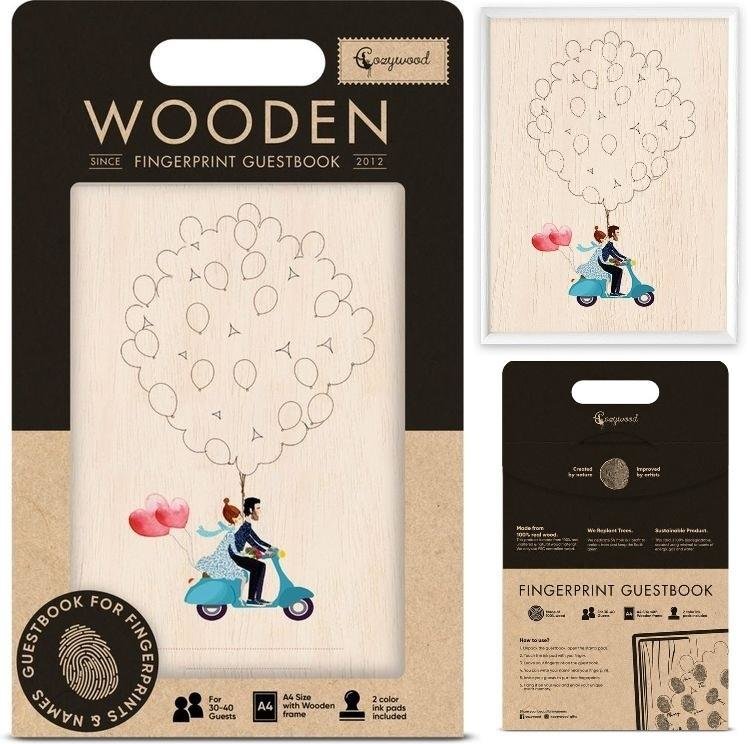 Księga gości weselnych w formie drewnianego obrazu oprawionego w białą ramkę, na który goście złożą swoje odciski palców, tworząc dzięki temu niezapomnianą pamiątkę dla Pary Młodej. Do zestawu dołączone są 2 tusze w kolorach czerwonym i niebieskim. Tusz w łatwy sposób można zmyć z palców. Rekomendowana jest dla 30-40 gości weselnych. Instrukcja obsługi: 1. Rozpakuj obrazek oraz tusze, 2. Dotknij wybrany tusz swoim palcem, 3. Umieść odcisk palca na drewnianym obrazie, 4. Przy swoim odcisku możesz złożyć swój podpis, 5. Zachęć pozostałych gości do zabawy, 6. Państwo Młodzi będą mieli niezapomnianą pamiątkę na ścianie w swoim domu.