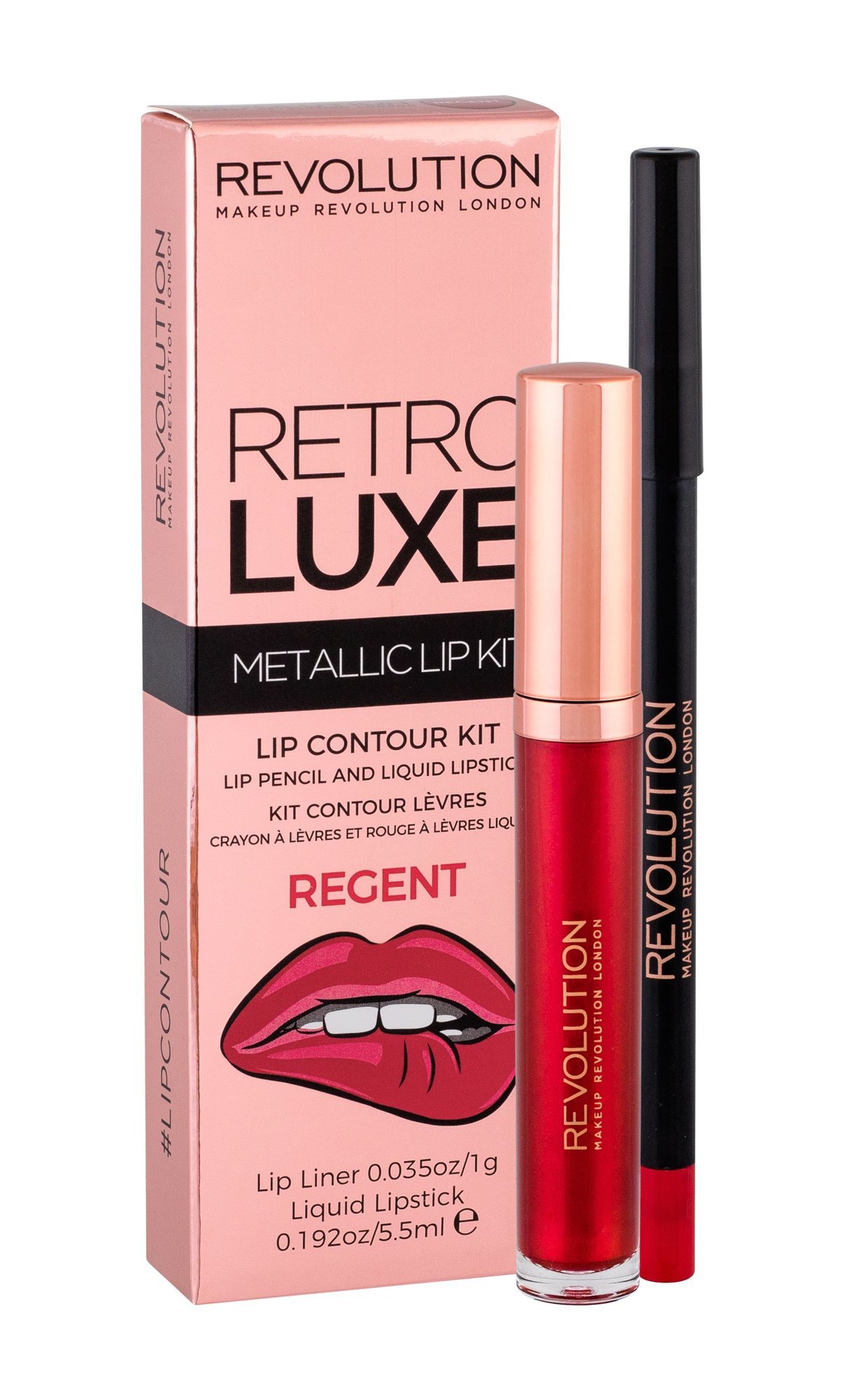Dárková sada **Makeup Revolution London Retro Luxe Metallic Lip Kit**. **Složení kazety**: **tekutá rtěnka 5,5 ml ** Tekutá rtěnka dodá rtům krásnou metalickou barvu. Odolné složení zajišťuje bezchybný vzhled během celého dne. **konturovací tužka na rty 1 g** Tužka na rty se snadno nanáší a zajišťuje dlouhotrvající výdrž. Dodá rtům krásnou barvu a zároveň prodlužuje vzhled rtěnky a zabraňuje rozmazání.