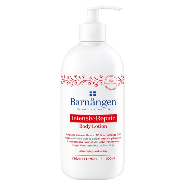 Barnängen Intensiv Repair - vyživující tělové mléko s Cold Cream - 400mlUžijte si vyživující tělové mléko Intensiv Repair. Kombinace severského bavlnovníku a 10% ochranného Cold Cream v jednom složení pečuje o suchou až velmi suchou pokožku pro dlouhotrvající hydrataci. Jedná se o originální švédský výrobek, který je vhodný pro dokonalou péči o tělo. Dermatologicky testováno.