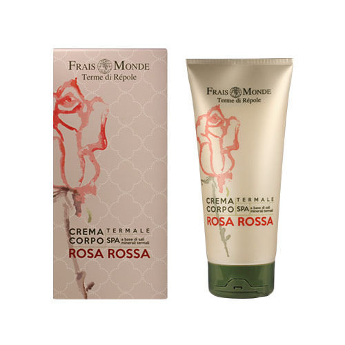 Tělový krém **Frais Monde Red Rose**. Tělový krém Frais Monde Red Rose pro hebkou a jemnou pokožku. Složení bohaté na výživné látky obsahuje termální minerální soli, které mají léčebný účinek a dokáží zharmonizovat každý typ pleti. Dále obsahuje máslo karité, makadamiový olej, meruňkový olej a extrakty z měsíčku lékařského. Ideální po koupeli nebo sprše pro obnovení hydratace pokožky celého těla. Dodává dlouhotrvající vůni rudých růží. Neobsahuje PEG a parabeny. Pro extra provonění můžete použít ještě parfémovaný olej se stejnou vůní - Red Rose. **Použití**: Aplikujte na suchou a čistou pokožku.