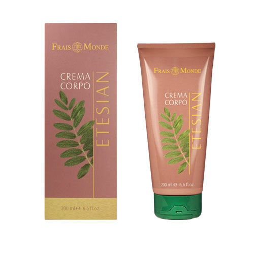 Tělový krém **Frais Monde Etesian**. Tělový krém Frais Monde Etesian pro hebkou a jemnou pokožku. Složení bohaté na výživné látky obsahuje máslo karité, makadamiový olej, meruňkový olej a extrakty z měsíčku lékařského. Ideální po koupeli nebo sprše pro obnovení hydratace pokožky celého těla. Dodává dlouhotrvající elegantní vůni Etesian. Neobsahuje PEG a parabeny. Pro extra provonění můžete použít ještě parfémovaný olej se stejnou vůní - Etesian. Severní vítr pohybuje květy, listy a stromy a kolem Egejského moře rozdmychává dokonalé vonné esence ambry, pižma a vanilky. Typické vůně Středozemí jako jsou citrusy, mandarinka, pelargonie a levandule vytvářejí nádhernou souhru ve spojení s olivovým dřevem. **Použití**: Aplikujte na suchou a čistou pokožku.
