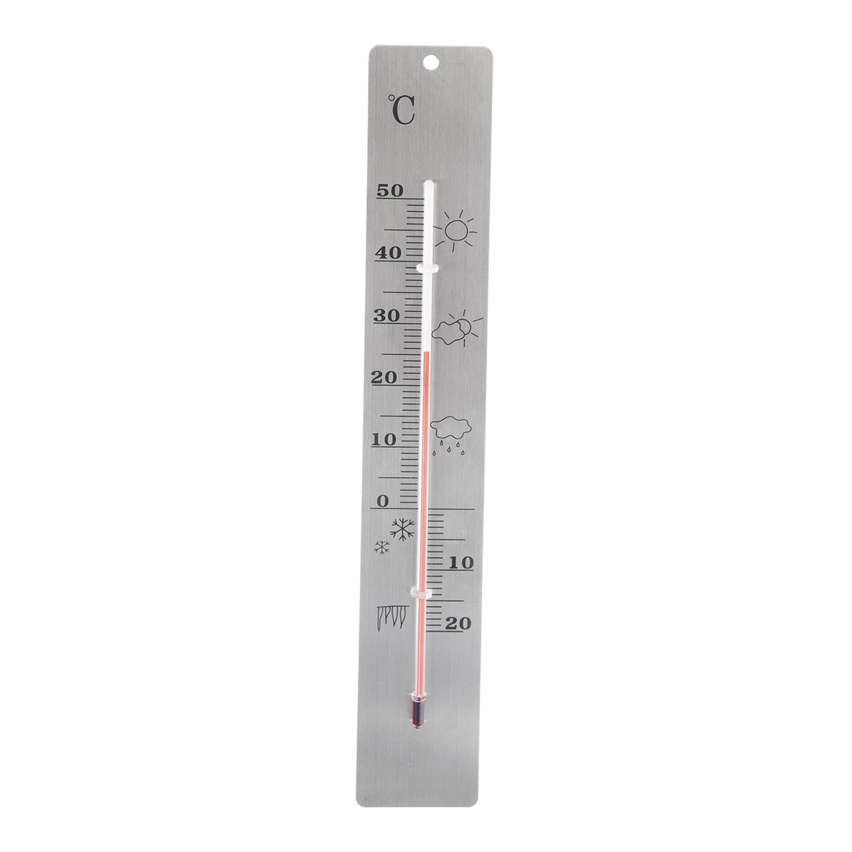 Univerzální teploměr využijete pro měření venkovní i vnitřní teploty. Stupnice od -20 °C do 50 °C je doplněna obrázky. Materiál: nerez ocel 430 s/s, sklo, plast PVC, petrolejová náplň. Teploměr upevněte venku na místo, které není vystaveno slunečnímu záření. Bez rtuti. Rozměry: 28x4,5 cm.