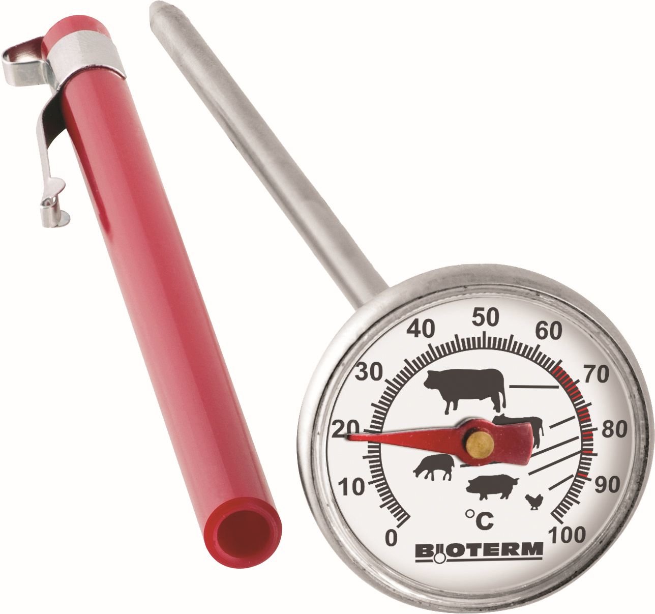 Masivní teploměr vyrobený z nerezové oceli pro regulaci teploty pečení různých druhů masa. Speciální stupnice přesně ukazuje ideální teplotu vaření pro drůbež, vepřové, jehněčí a telecí maso. Tepelný detektor je umístěn mezi 1,3 cm a 5 cm od začátku špejle. Abyste zabránili znečištění nebo poškození, uložte hrot teploměru do plastového krytu, který je součástí balení. Technická data: teplotní rozsah od 0 °C do 100 °C; přesnost měření: +/- 2 °C.