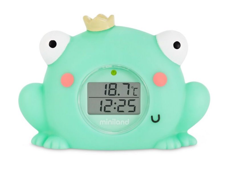 Digitální teploměr v podobě žabičky slouží jako pokojový teploměr a zároveň umožňuje měření teploty ve vaně. Teploměr je navržen tak, aby sloužil i jako hračka do koupele. Jeho součástí jsou hodiny a stopky, které vám umožní měřit dobu koupele. Teploměr za vás hlídá i optimální teplotu ve vaně, pokud je voda příliš studená, rozsvítí se zelené světýlko, pokud je příliš teplá, rozsvítí se červené světýlko.