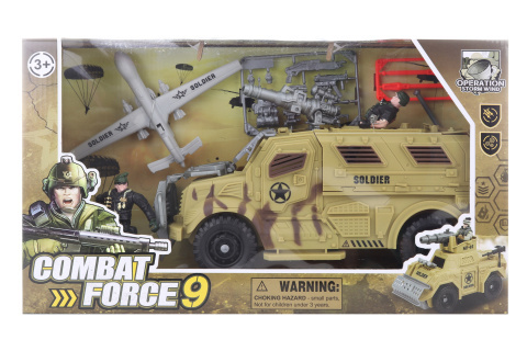 Vojenská sada obsahuje velké terénní auto o velikosti cca 29 x 15 cm, letadlo, 2 vojáčky a další doplňky. Rozměry balení cca 43 x 24,5 x 11,5 cm. Věk 3+