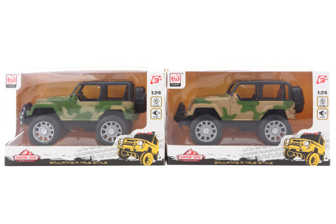 Vojenské terénní auto na baterie. Auto vydává zvuky a svítí. Napájení na 3 AG13 baterie (jsou součástí). Rozměry auta cca 14,5 x 7 cm. Rozměry balení cca 18,5 x 11 x 9,5 cm. Věk 3+