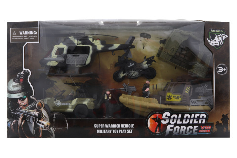 Velká vojenská sada obsahuje bunkr, člun, motorku, terénní auto, helikoptéru a 3 vojáčky. Rozměry balení cca 71,5 x 37,5 x 12 cm. Věk 3+ číst celé
