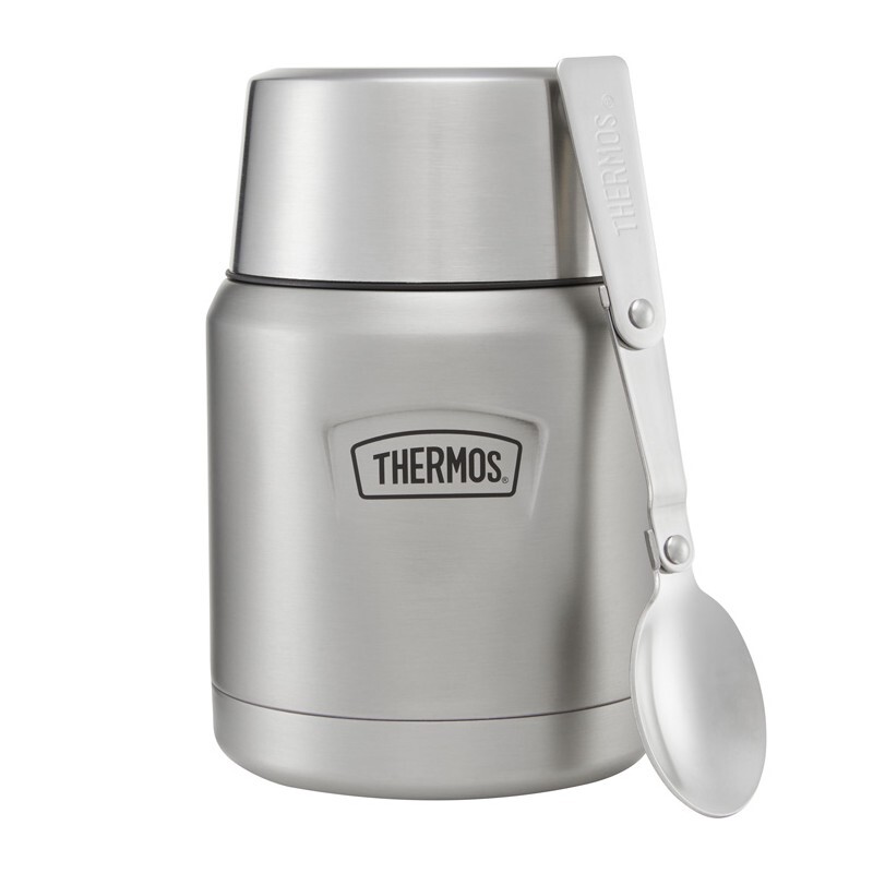 Nerezová vakuově izolovaná termoska na jídlo s integrovanou lžící a šálkem o objemu 470 ml. číst celé