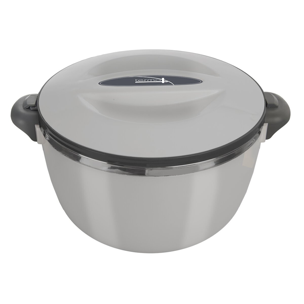 Termomísa v plastovém obalu s nerezovým vnitřkem udrží vložený pokrm po dlouhou dobu teplý nebo naopak chladný. Snadné uzavření otočením plastového termo víčka. Využijete ji v domácnosti, zaměstnání i na cestách, v létě i zimě. Skvělé izolační vlastnosti. Je lehká, snadno přenosná. Hladký povrch je snadno omyvatelný. Výborné využití v horkých letních dnech na zmrzlinu. Délka udržení teploty v nádobě závisí na okolní teplotě, resp. teplotním rozdílu vnější teploty a teploty uvnitř nádoby. Před vložením studeného pokrmu, např. zmrzliny, vložte nádobu cca na hodinu do ledničky, prodloužíte tím chladící efekt. Při vkládání teplého jídla nalijte dovnitř horkou vodu, kterou zhruba po 1-2 minutách vylijte. Materiál: nerez, plast PP. Rozměry: pr. 24 cm, v. 16 cm, š. s uchy 31 cm, užitný objem 3,5 l, celkový objem 3,9 l. Není vhodná do myčky.
