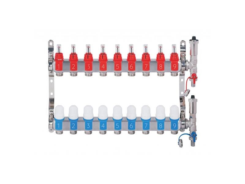 Nerezový rozdělovač hranatý - 9-cestný - průtokoměry, termostat. ventily, automat. odvzd. ventily, připojení 1" závit