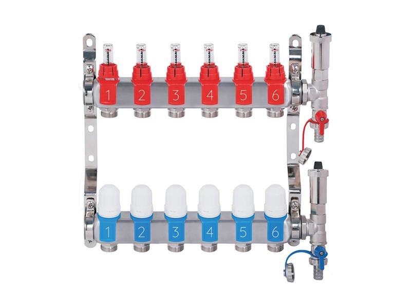 Nerezový rozdělovač hranatý - 6-cestný - průtokoměry, termostat. ventily, automat. odvzd. ventily, připojení 1" závit
