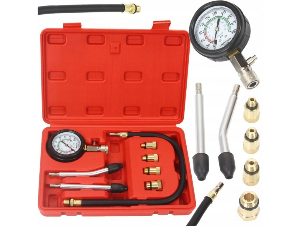 Přesný přístroj pro měření kompresního tlaku ve válcích zážehových motorů osobních a lehkých užitkových automobilů přes otvory pro zapalovací svíčky. Přístroj je včleněn do sady v plastovém kufříku, která obsahuje tlakoměr 0-20 bar, opatřený vypouštěcím ventilem, umožňujícím opakování měření komprese stejného válce bez vyšroubování koncovky, vysokotlakou připojovací hadici dl. 400 mm, na kterou lze připojit některý z napojovacích adaptérů se závity (M18x1,5/M14x1,25/M12x1,25/M10x1,0).