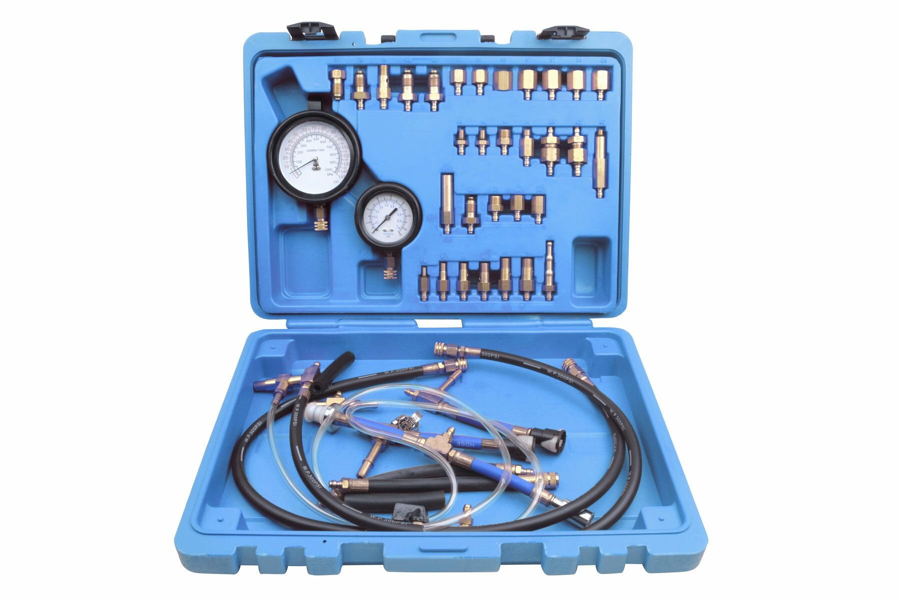 Přístroj pro měření nízkého i vysokého tlaku palivového systému koncipovaný pro systémy vstřikování benzínu většiny evropských, asijských i amerických automobilů (jednobodové i vícebodové vstřikování, mechanické i elektronické vstřikovací systémy) tvoří v plastovém kufru 2 tlakoměry, příslušná rychlospojková připojení, sada hadic se spojkami a velmi obsáhlá sada připojovacích adaptérů. Obal může být i v jiném barevném provedení.